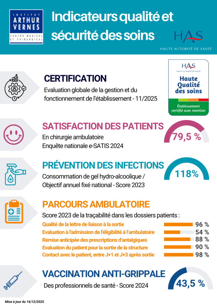 La direction de la clinique de l’Institut Arthur Vernes est pleinement engagée dans une politique d’amélioration continue de la Qualité et de la Sécurité des soins pour :